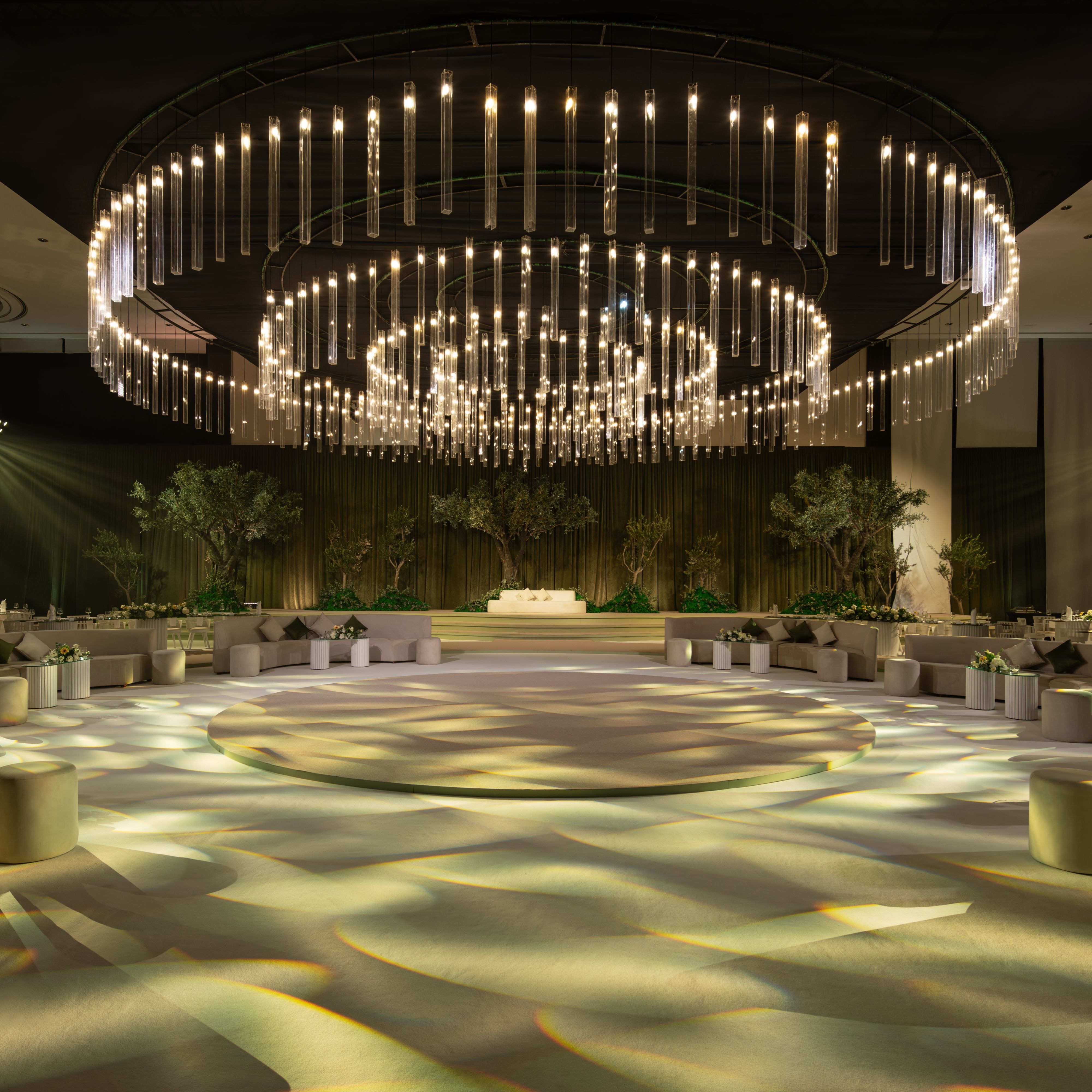 无论您向往盛大的婚礼还是温馨的仪式,我们的活动中心都能满足您的需求。宽敞的前厅区可用于布置迎宾区,而宴会厅楼上的新婚套房则为新娘及随行人员提供了便利的空间。宴会厅设有50多个吊挂点,能够轻松实现吊挂装饰、空中表演等各类创意,让婚礼策划师尽情发挥想象。