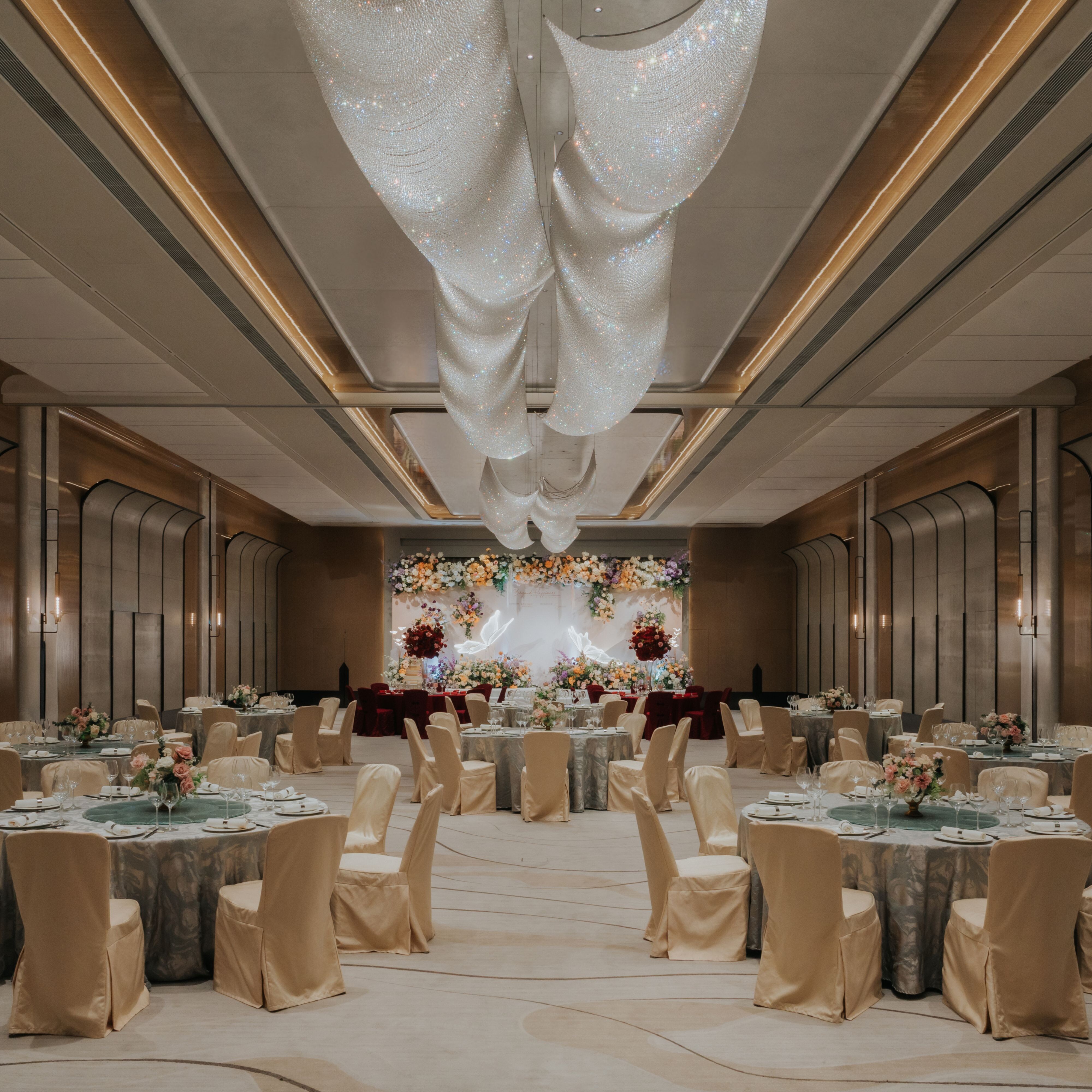 大宴会厅拥有令人惊叹的挑高天花板和闪耀的水晶吊灯,至多可容纳约36张圆桌或招待约500位宾客。此外,大宴会厅还配备了先进的高清LED显示屏,是展示您珍贵时刻的理想之选。
