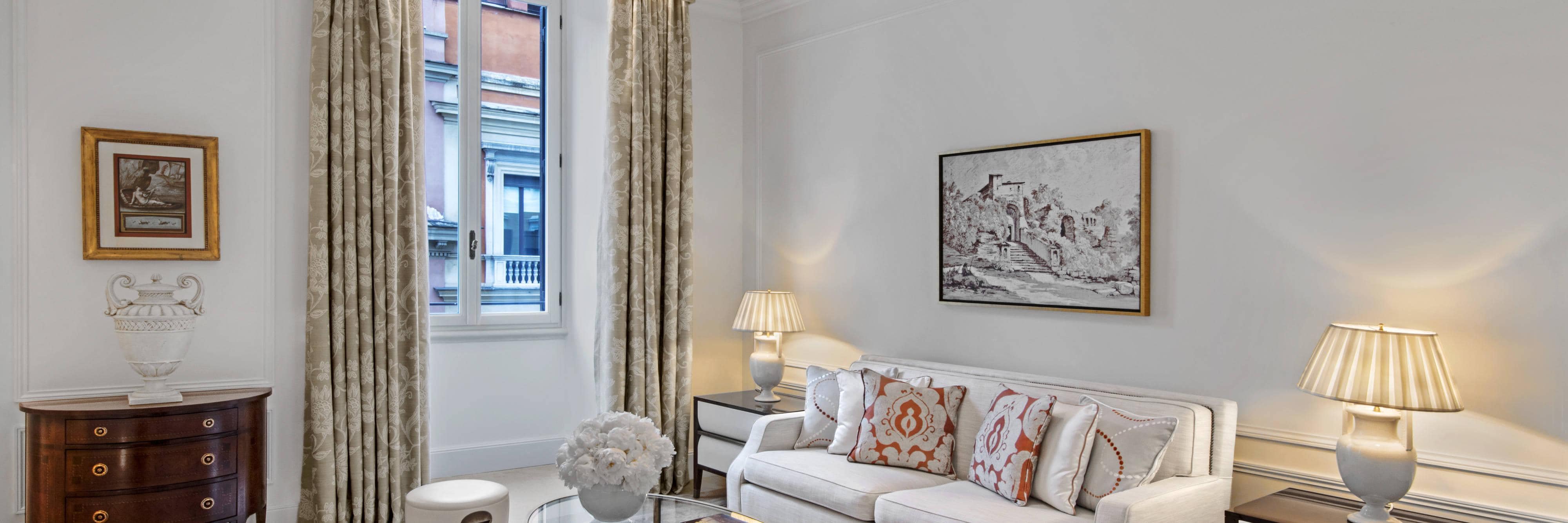 瑞吉套房面积约 55 平米,采用明亮宽敞的开放式布局,致敬罗马的永恒优雅风范。套房拥有引人入胜的空间设计,通过现代风格焕新呈献原初豪邸的特色,将罗马城古老与现代的典型元素和谐相融。套房可连通一间高级客房,打造兼具实用性和迷人魅力的的城市居所。